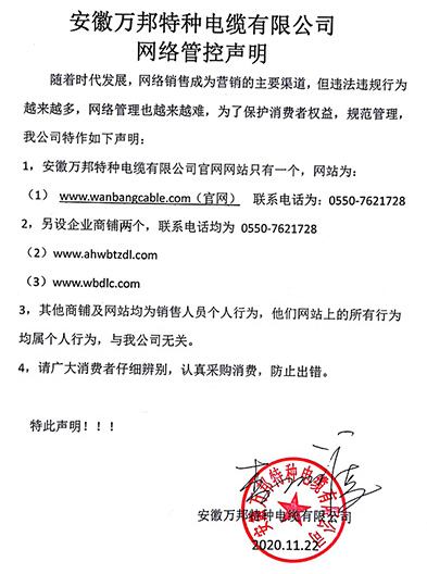 鄭重聲明:安徽萬邦特種電纜有限公司官方網站為:www_wanbangcable_com.studiolamise.com,除此之外無任何子網站或合作網站,其余均為假冒偽劣。電話:0550-7621728 13485756353 地 址:安徽省天長市滁州高新技術產業開發區經四路29號